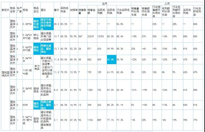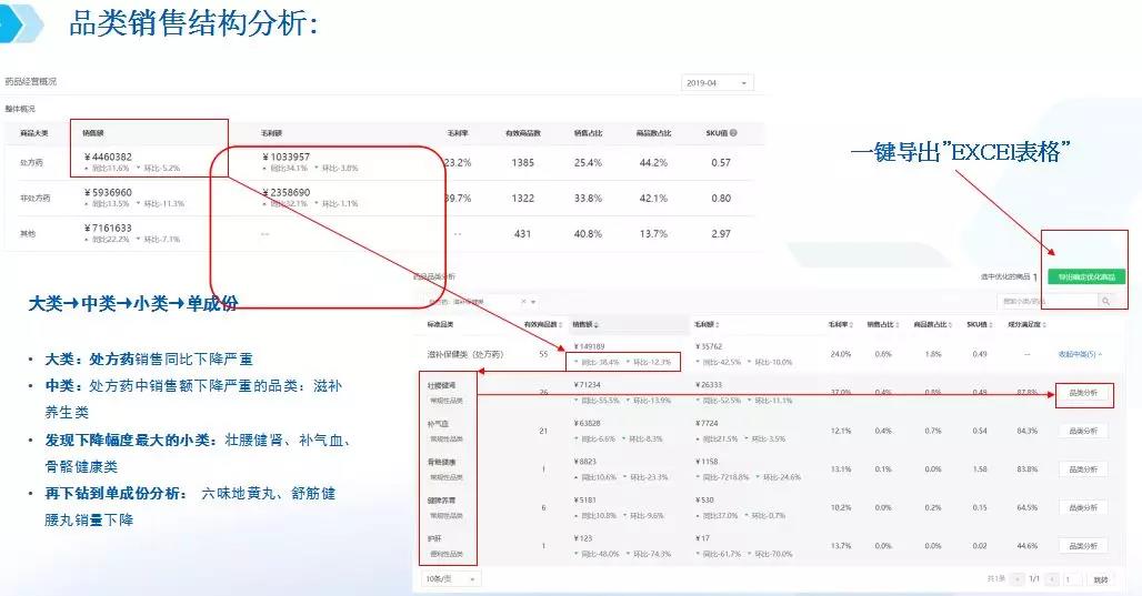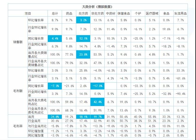 大類分析主要看整體銷售結構,找出核心大類的增長機會點。例如,這組數(shù)據(jù)中不管是整體毛利率還是銷售額增長率,都低于行業(yè)均值。細分處方藥、非處方藥及中藥等品類的情況可以看出,處方藥的同環(huán)比銷售額以及銷售占比均低于行業(yè)值,而毛利率卻高于行業(yè)值?梢缘贸觯瓿踔贫ㄌ幏剿帪楹诵脑鲩L大類的策略沒有落地。所以,接下來做中類、小類跟單成分分析的時候需要進行針對性監(jiān)控。