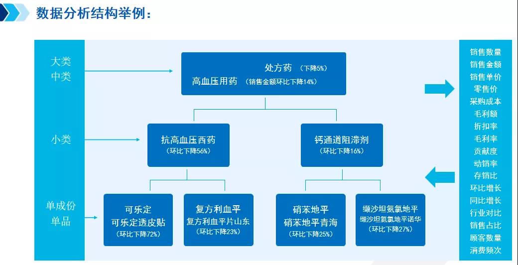 得出分析結果,提升方案就唾手可得了嗎?并不!確定了核心增長品類之后,需從整體到大類、中類、小類、單成分單品進行抽絲剝繭,基于多維逐層分析,最后才能精準地制定出提升方案。