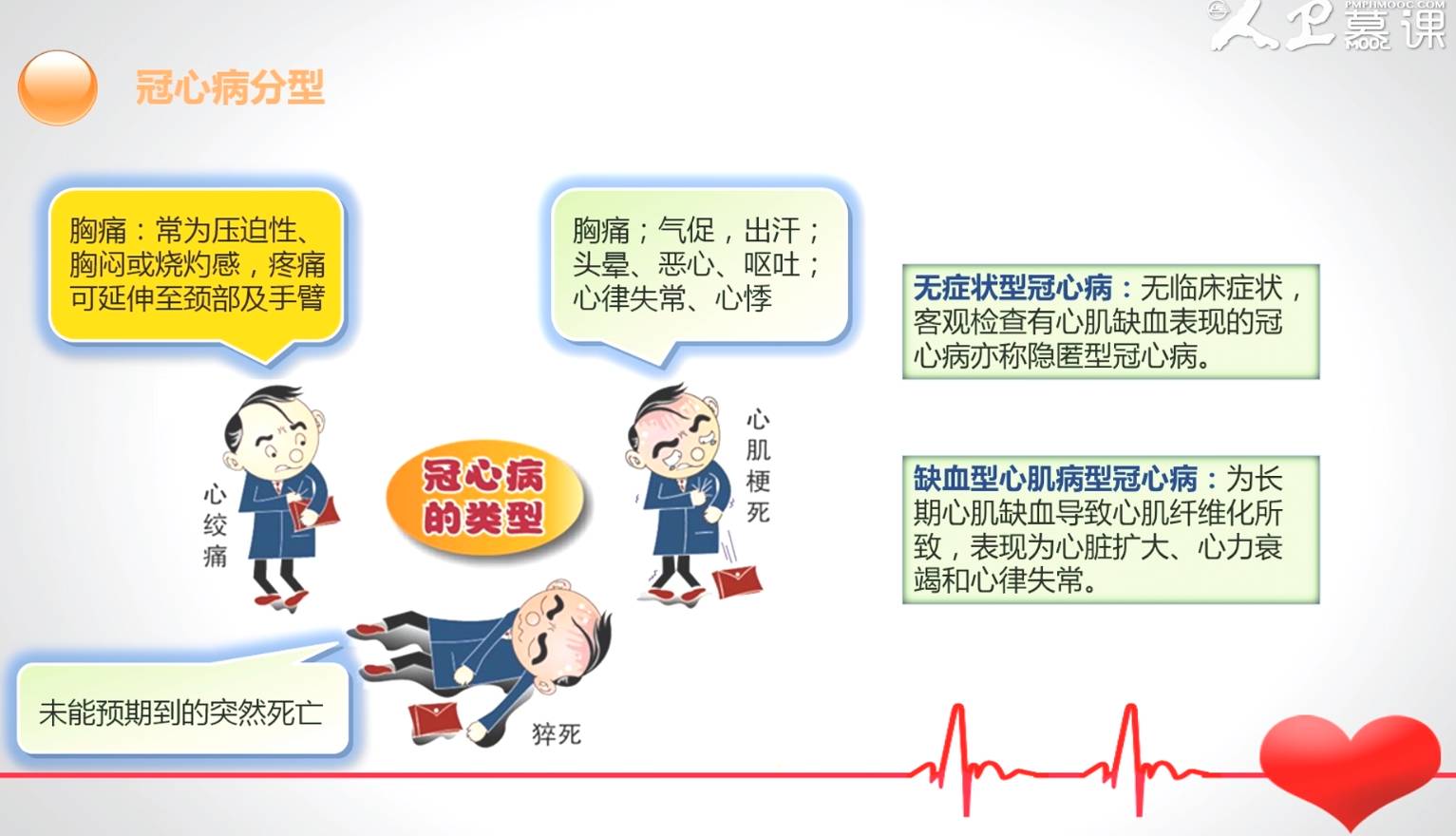 2. 心肌梗死型冠心。 在冠狀動(dòng)脈病變的基礎(chǔ)上,發(fā)生冠狀動(dòng)脈供血急劇減少或中斷,使相應(yīng)的心肌嚴(yán)重而持久地急性缺血導(dǎo)致心肌壞死,表現(xiàn)為嚴(yán)重持久的胸痛、氣促、出汗頭暈、惡心、嘔吐;心律失常、心悸等。